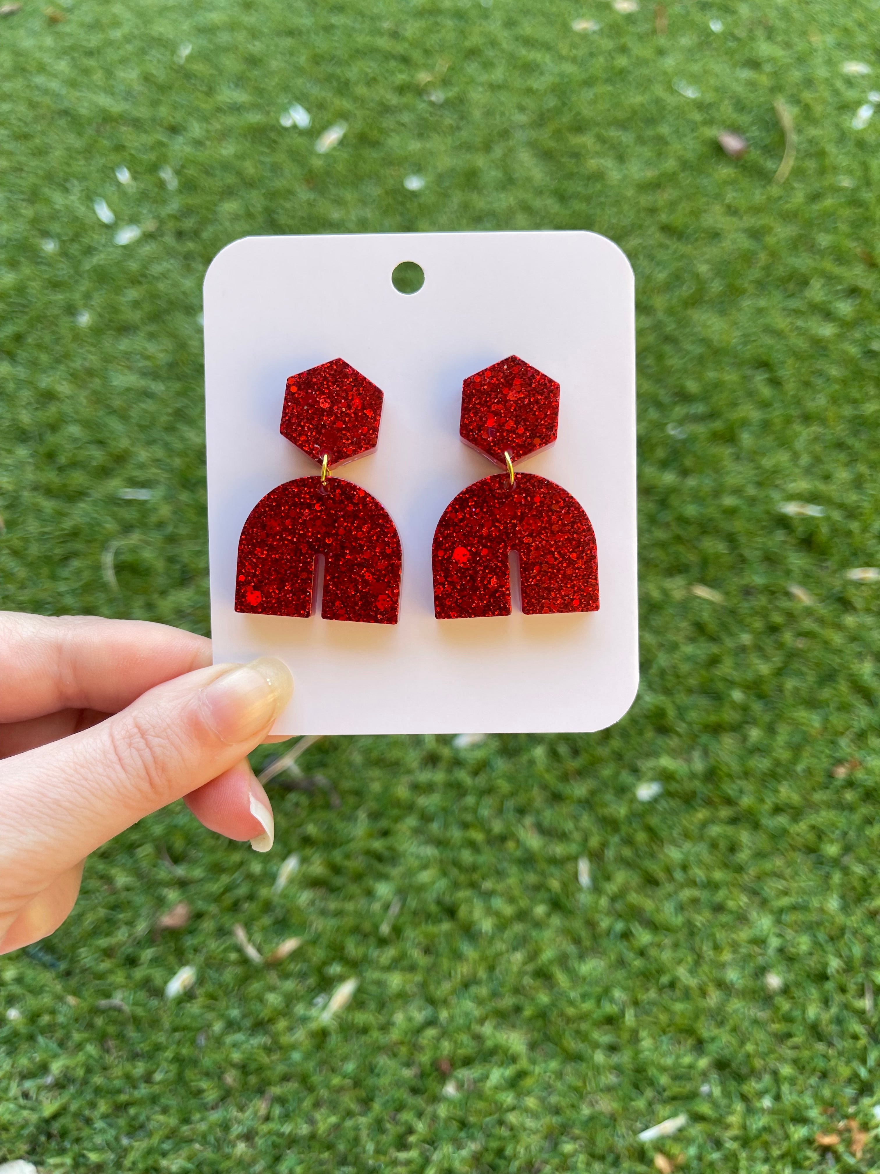 Hexagon Arch Glitter Earrings- Red
