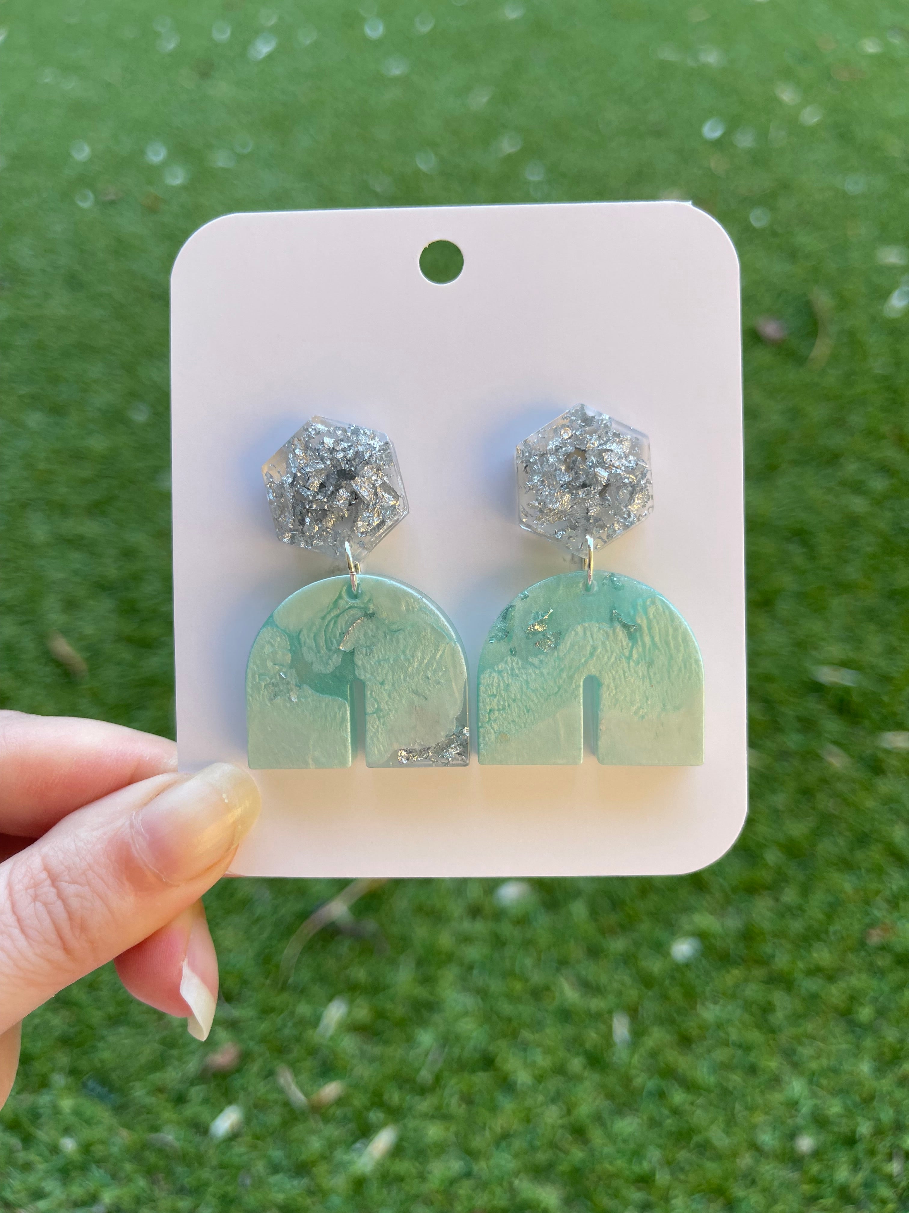 Reviews Hexagon Arch Glitter Earrings- Silver and Mint 0 out of 5 stars This product has no reviews yet Write a review Write a review