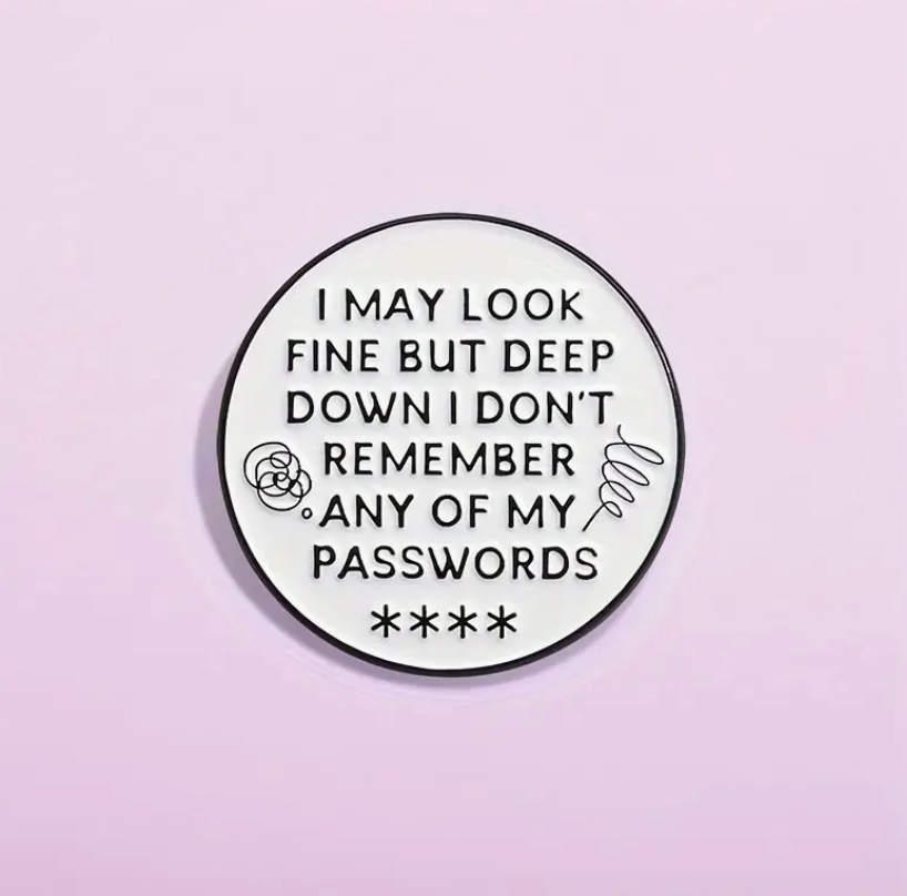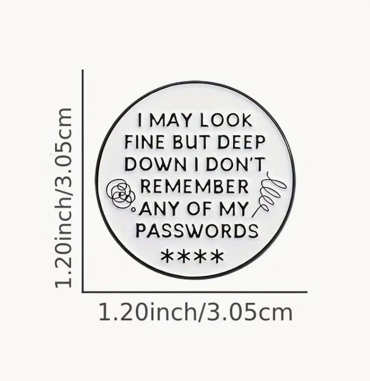 'I May Look Fine But Deep Down I Don't Remember Any of My Passwords' Pin Share WhatsApp Deel X 'I May Look Fine But Deep Down I Don't Remember Any of My Passwords' Pin Share WhatsApp Deel X Product form $6.00 1 in stock Free pickup in our shop(s) SKU: 3806 Barcode: 9876548340 Default Title Add to cart This item is a recurring or deferred purchase. By continuing, I agree to the cancellation policy and authorize you to charge my payment method at the prices, frequency and dates listed on this page until my order is fulfilled or I cancel, if permitted. Guaranteed secure & safe checkout.